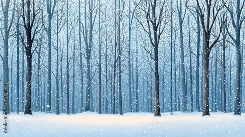 A serene winter landscape with delicate snowfall, showcasing bare trees in a tranquil forest setting.