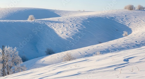 A serene winter landscape with snow-covered hills and trees.