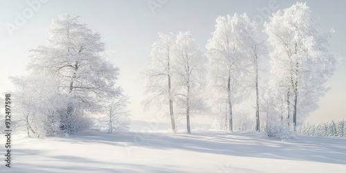 A serene winter landscape with snow-covered trees in soft white and grey tones, under a clear, pale blue sky, with gentle shadows creating a sense of calm and quiet.