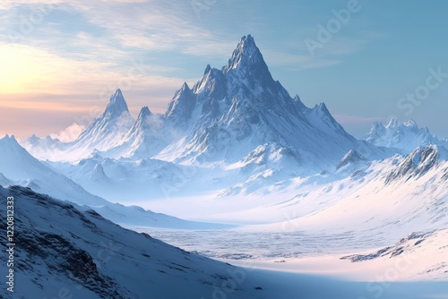 A serene winter mountain landscape with snow-dusted peaks and a clear horizon