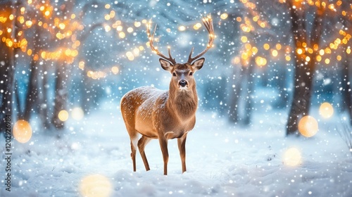 A serene winter scene featuring a lone deer with antlers standing in a snowy forest.