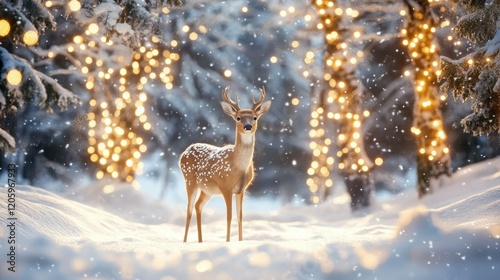A serene winter scene featuring a lone deer with antlers standing in a snowy forest.