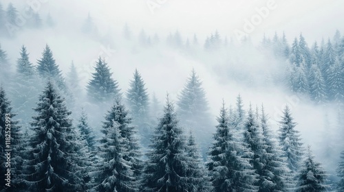 A serene winter scene featuring snow-covered evergreen trees in a foggy atmosphere.