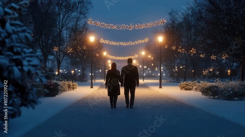 A serene winter scene showcasing a couple walking hand-in-hand along a snowy path adorned with glowing lights and lampposts.