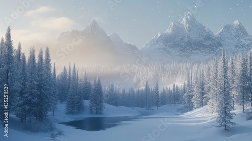A serene winter scene with the Northern Lights above snow-covered mountains and trees, casting a warm and magical light on the icy landscape.