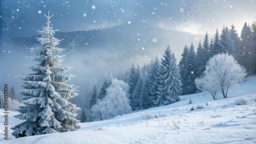 A serene winter wonderland scene, showcasing snow-covered evergreens and a dusting of fresh snow falling gently on a frosty landscape