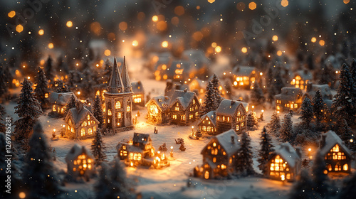 A serene winter wonderland village made of ice and snow, with modern sculptures and glistening structures, embodying tranquility, cold beauty, and the magic of winter's frozen landscape