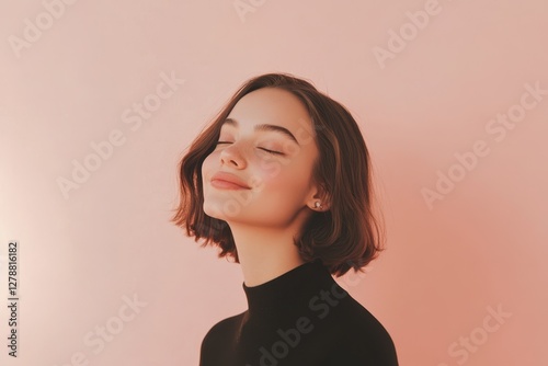 A serene woman in a black top, eyes closed, exudes tranquility and introspection, capturing a moment of peace and reflection.