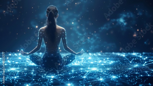 A serene woman meditates, her form harmonizing with the digital network around her under a twilight ambiance.