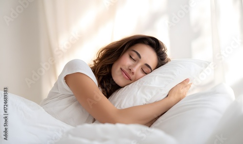 A serene woman peacefully sleeping on a large soft white pillow, hugging it gently, with a relaxed smile on her face