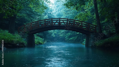 A serene wooded scene featuring a wooden bridge over a misty river, surrounded by lush greenery and a tranquil atmosphere.