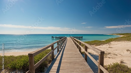 A serene wooden pier stretches into the clear blue waters, framed by sandy beaches and vibrant greenery, creating a tranquil coastal escape.