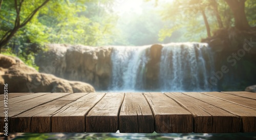 A serene wooden platform overlooking a tranquil waterfall in a lush forest setting.