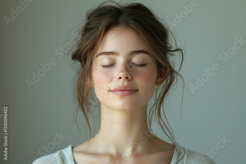 A serene young woman with freckles and brown hair, eyes closed, peaceful expression.