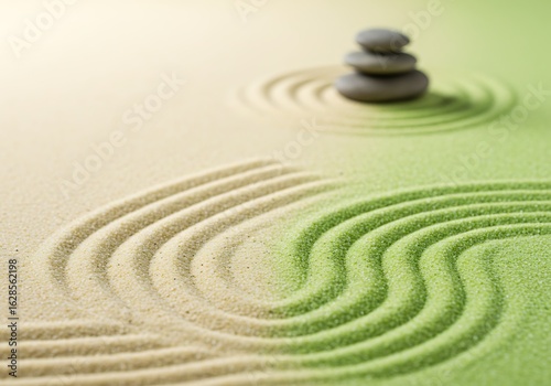 A serene zen garden scene features a stack of stones and raked sand patterns.