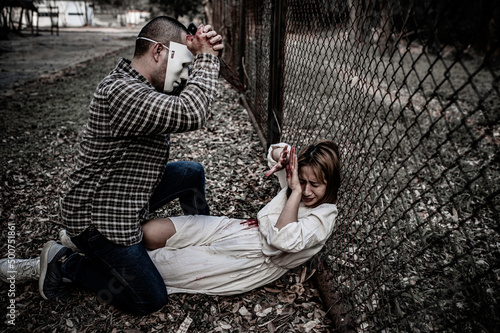 A serial killer scene is about to kill an Asian woman,concept thriller scene,Halloween festival