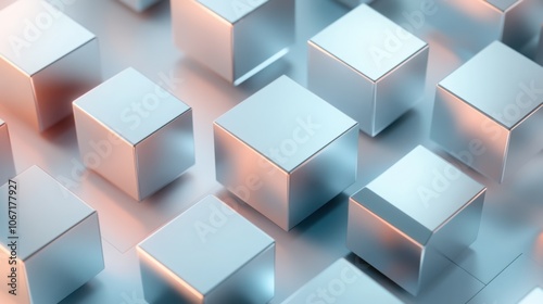 A series of 3D cubes arranged in a geometric pattern, each with a different metallic finish, floating on a light gray background. .