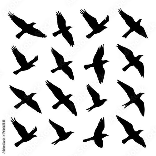 A series of black and white silhouettes of birds flying in a row. The birds are all different sizes. Vector. Silhouette illustration.
