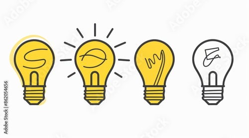 A series of lightbulb icons in yellow, with one bulb having an outline drawn on it to represent idea generation and the other three filled with simple doodles symbolizing creativity and innovation.