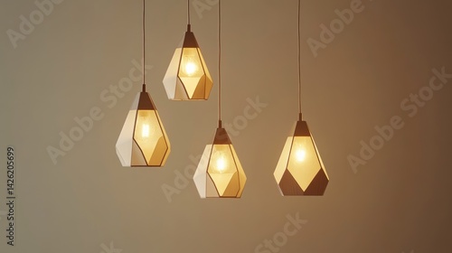 A series of modern minimalist pendant lights with geometric shapes hanging in a line, casting a warm glow against a neutral background, perfect for interior design concepts.