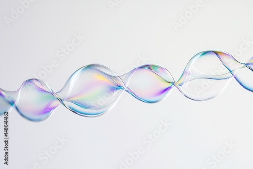 A series of soap bubbles drifting through the air, capturing the light and reflecting soft rainbow hues, with a minimalistic white background.