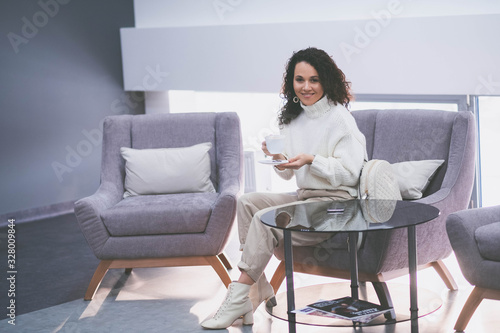 A serious beautiful woman is drinking tea in the clinic waiting for a dentist appointment