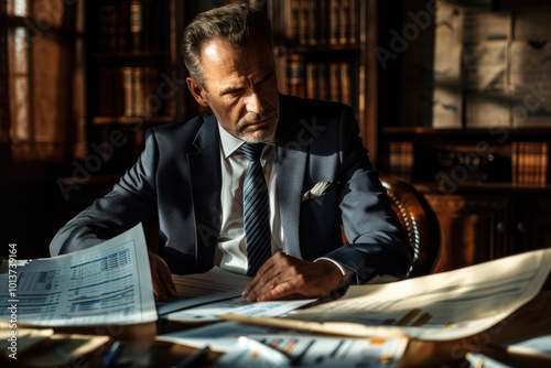 A serious businessman, clad in a business suit, sits alone at his office desk, deeply engrossed in planning strategy as he works on his laptop with intense focus.