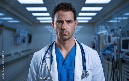 A serious looking doctor in a hospital hallway with a stethoscope around his neck.