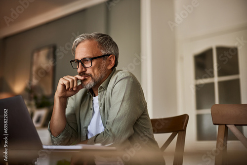 A serious senior male freelancer sitting on a wooden chair and working over a laptop.