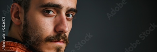A serious young man in casual attire looks intently at the camera against a dark background, conveying intensity and depth.