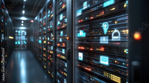 A server room filled with numerous servers, each illuminated by vibrant, glowing lights, showcasing advanced technological infrastructure.