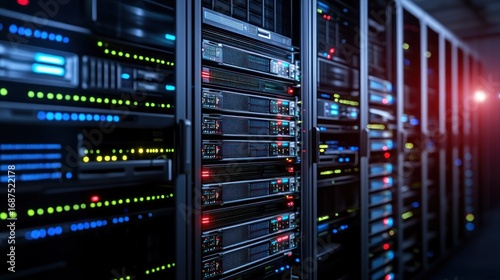 A server room with rows of computer servers, illuminated by blinking lights and a red light source.