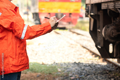 A service technician is checking on heavy machine maintenance checklist, with an ancient train locomotive head as blurred background. Transportation industrial working scene, selective focus at hand.