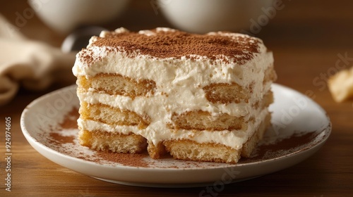 A serving of classic Italian tiramisu, with layers of coffee-soaked ladyfingers and mascarpone cream.