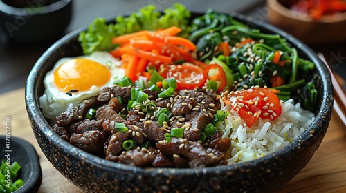 A serving of Korean bibimbap with rice, vegetables, and beef.