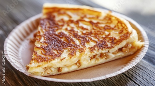 A serving of Korean sweet pancakes hotteok, filled with brown sugar, cinnamon, and chopped nuts, served on a paper plate.