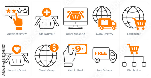 A set of 10 shopping icons as customer review, add to basket, online shopping