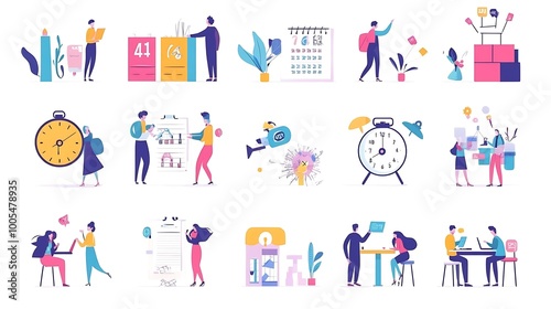A set of 12 illustrations showing various ways people are working together in an office setting. The illustrations depict tasks such as scheduling, planning, strategizing, and collaborating.