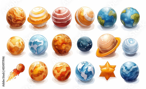 A set of 15 cartoon planets. The planets are all different colors and sizes, and they have different features.