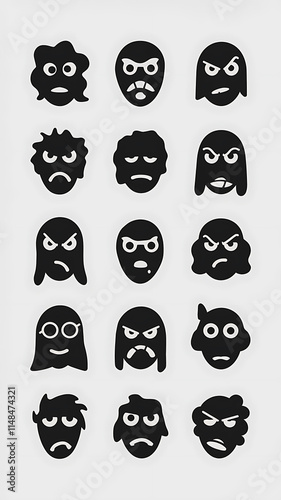 A set of 16 tiny black silhouette faces with different expressions, isolated on a white background
