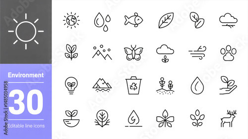 A set of 30 minimalist line art icons arranged in a grid format, depicting environmental and nature themes.
