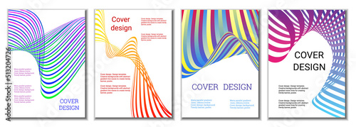 A set of 4 abstract covers. Wavy parallel gradient lines, ribbons evolve. Cover design, background. Trendy banner, poster.