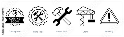 A set of 5 mix icons as coming soon, hand tools, repair tools