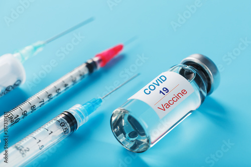 A set of ampoules with the inscription Covid-19 vaccine and a set of syringes against a blue background.