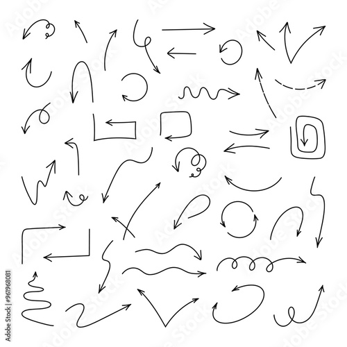 A set of arrows drawn with a comic book style marker, doodle isolated on a white background, hand-drawn. A decorative element for design, decoration, and notes. Collection of direction signs