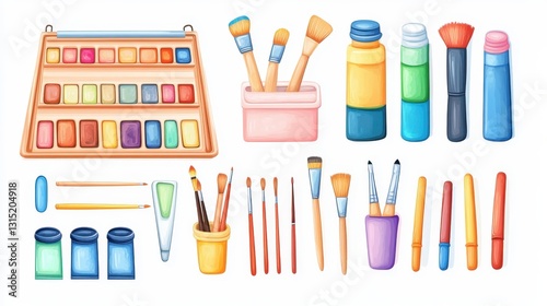 A set of art supplies such as paints, brushes, and sketchbooks for students on a white isolated background