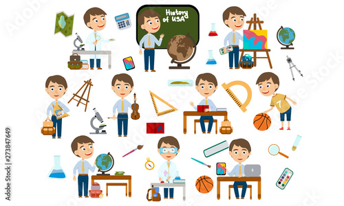 A set of boy with brown hair school student. Student in different lessons: science, history, sports, art, maths, English, information technology, music. Conducting experiments. Cute vector