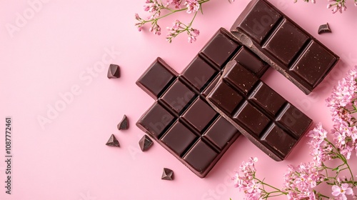 A set of chocolate bars in artisanal packaging, isolated on a pastel background with small decorative flowers