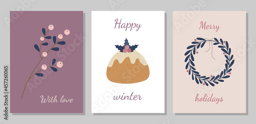 A set of Christmas cards. Happy New Year. Vector illustration. Suitable for greeting cards, invitations to a party. With love, happy winter, merry holidays.