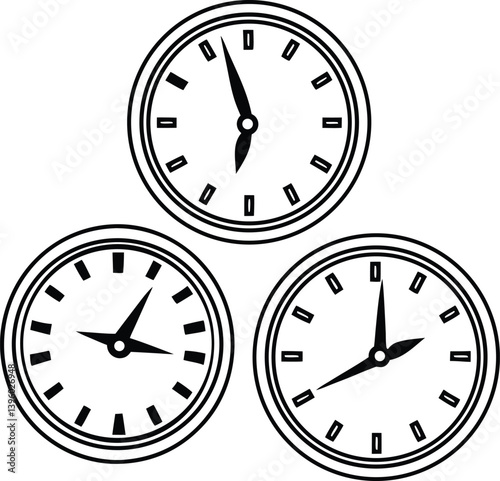 A set of clocks and vector clocks with various designs, symbols, and time indicators in a business office setting
